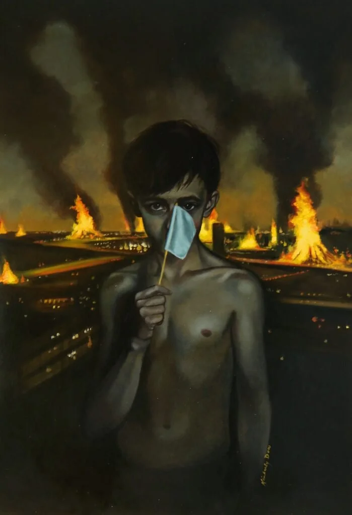 This painting is born out of grief, reckoning, and an unflinching gaze at the world we are leaving behind for the next generation. A young figure stands against the backdrop of a world unraveling—flames, smoke, and the shadow of destruction pressing in from every side. There is no innocence spared here. The child does not look away; instead, he becomes the unwilling witness to the choices of those who came before him.