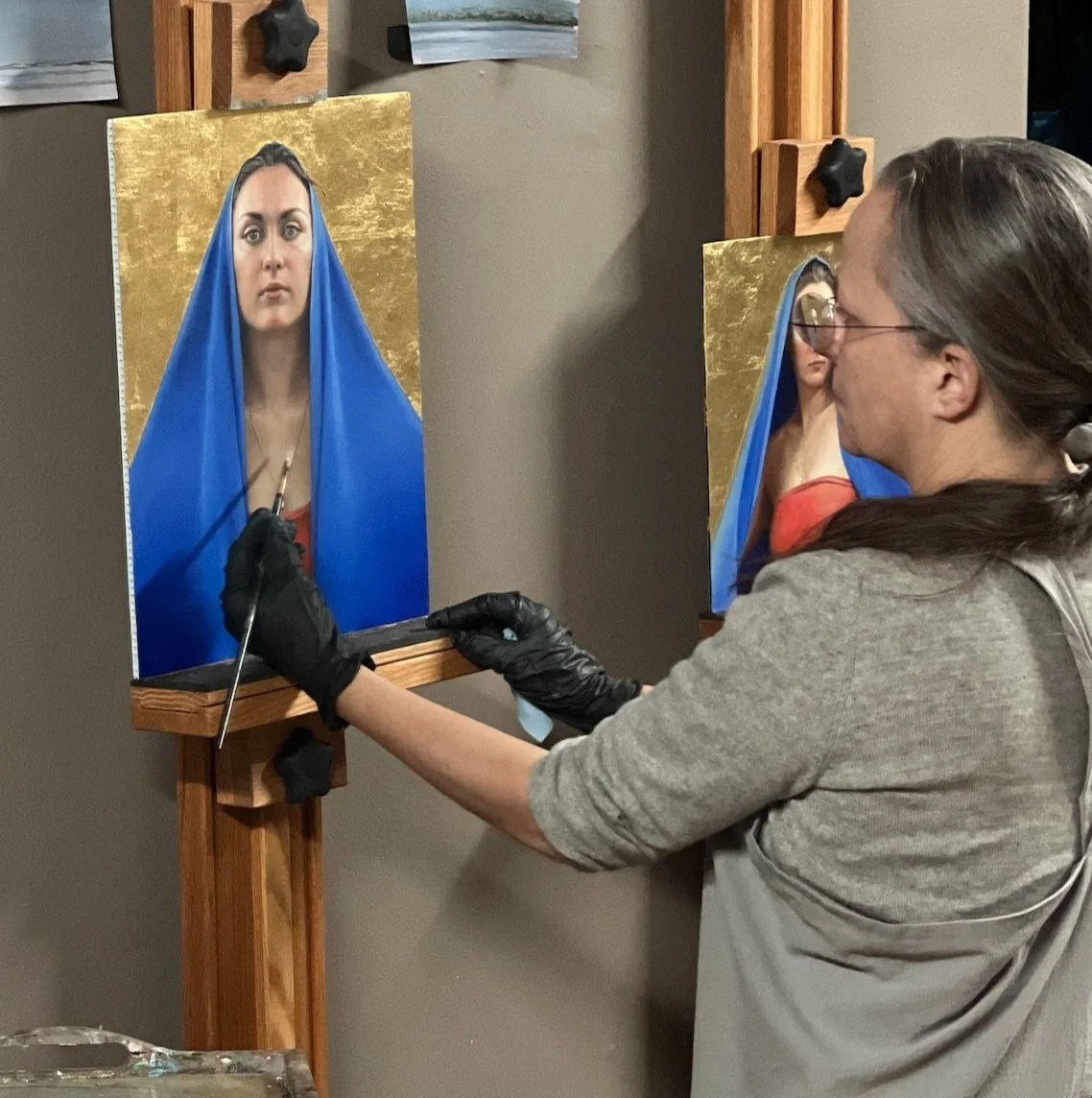I have a wonderful network of other artists. The artists who are in PoetsArtists (and Didi herself) are great resources for questions around shipping, particular shows, and all art industry questions. I have other artists and artist groups in social media and in various forums who I turn to for technical assistance such as George O’Hanlon and Tatiana at Natural Pigments, framing forums like The Grumble, sculpture and gilding forums, various societies which have many helpful members. For feedback on my work, I often rely on several specific peers to look at my work at various stages during creation and let me know if anything catches their eye as being problematic to the flow of the piece, and who will often ask me questions about what I’m trying to do in the work which helps me to clarify and strengthen my direction.