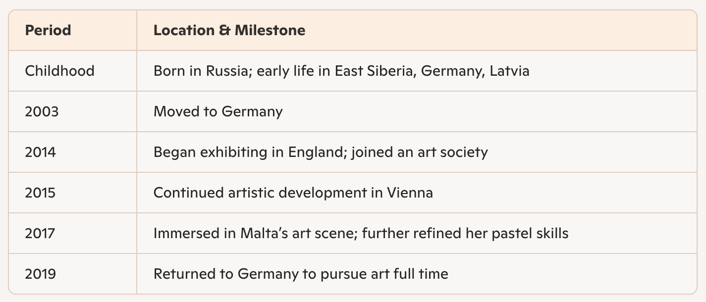 Elena’s multicultural background plays a central role in shaping her artistry. Born in Russia and spending her formative years in East Siberia as well as in Germany and Latvia, she later moved to Germany in 2003. Her diverse early experiences, coupled with classical art training at the Irkutsk Regional Youth Art School, laid a strong foundation for her work. After obtaining two master’s degrees in languages and literatures—and spending time teaching and translating—she fully embraced her artistic calling. A turning point came during her time in England in 2014 when, after joining a local art society and winning an award, she pursued further studies in pastel techniques. Her journey continued through stints in Vienna, Malta, and eventually a return to Germany, allowing her to absorb a rich array of cultural influences that manifest in themes of displacement, memory, and identity .